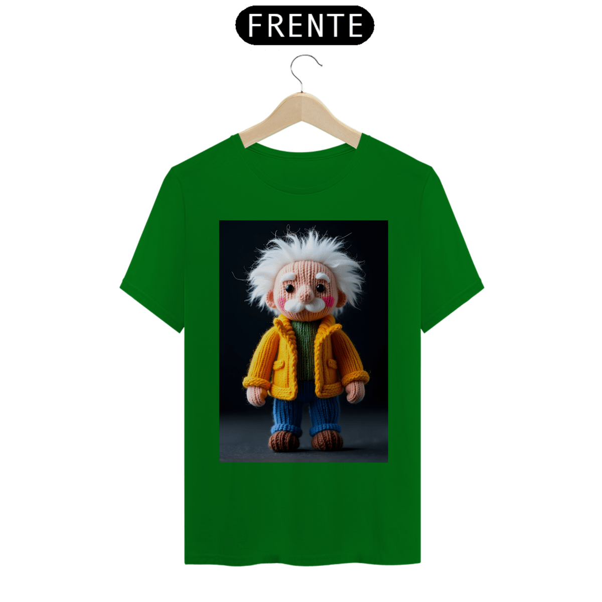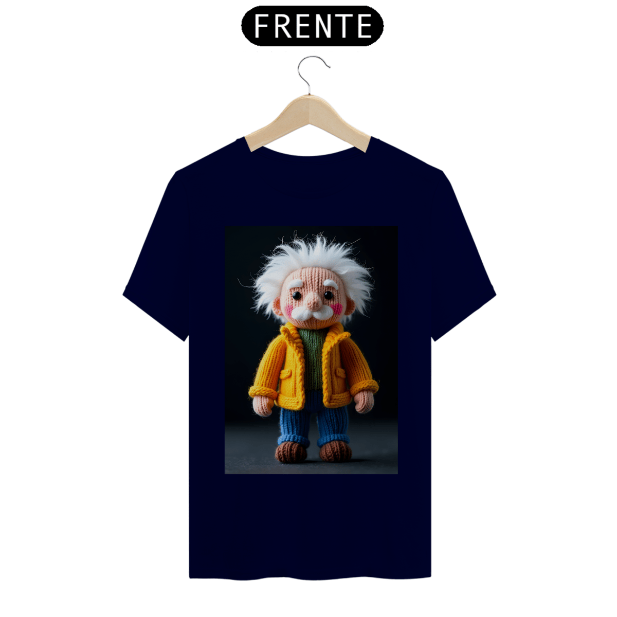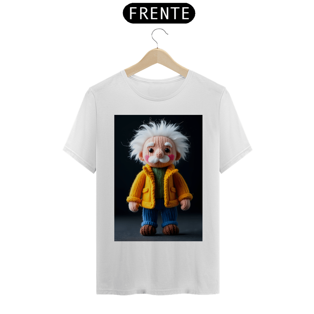 A genialidade pode — e deve — ser representada com ternura! A camiseta "Albert" estampa um adorável boneco de crochê inspirado em ninguém menos que Albert Einstein.
