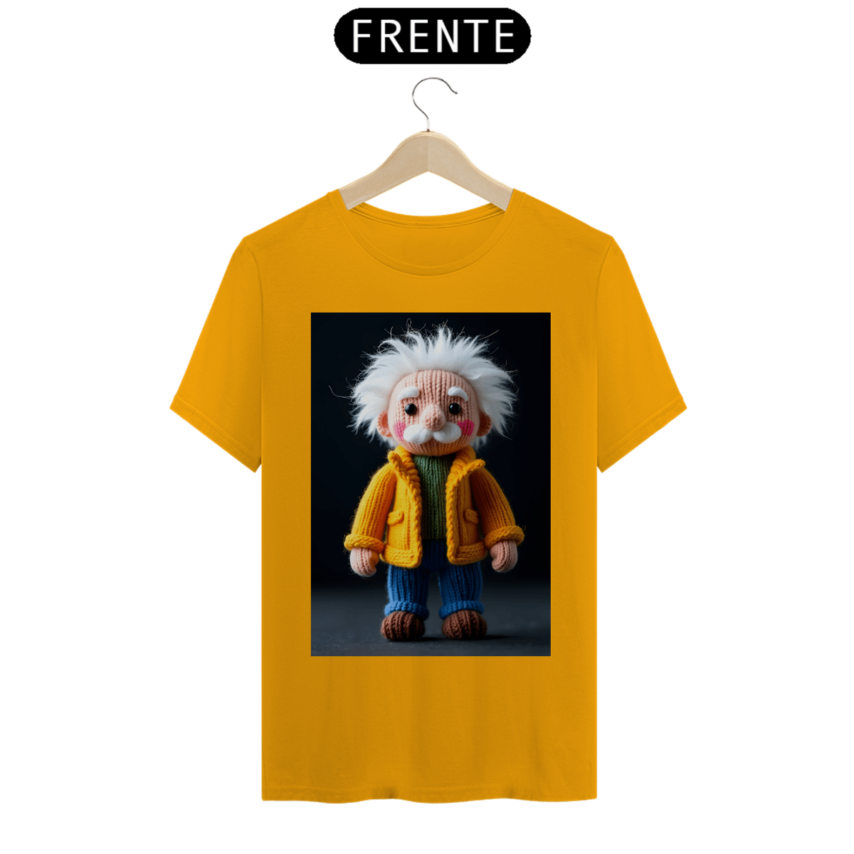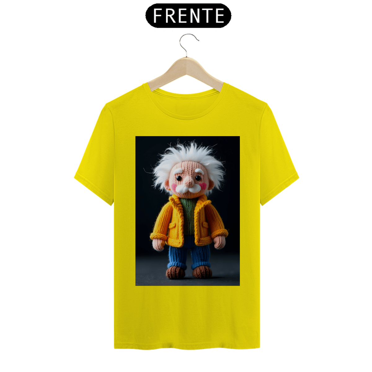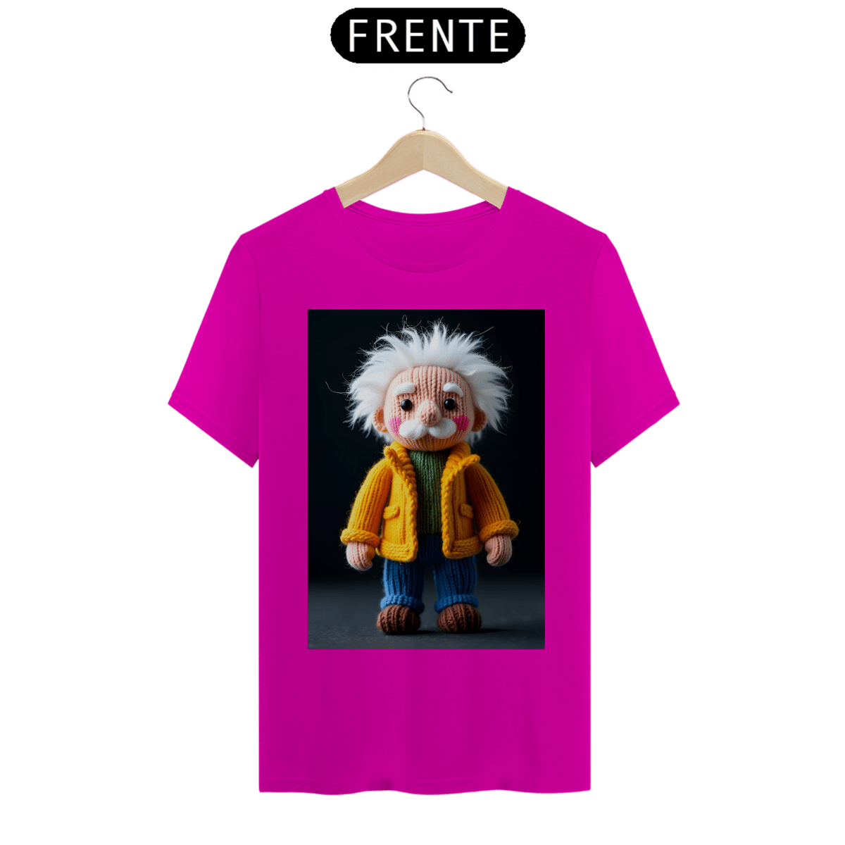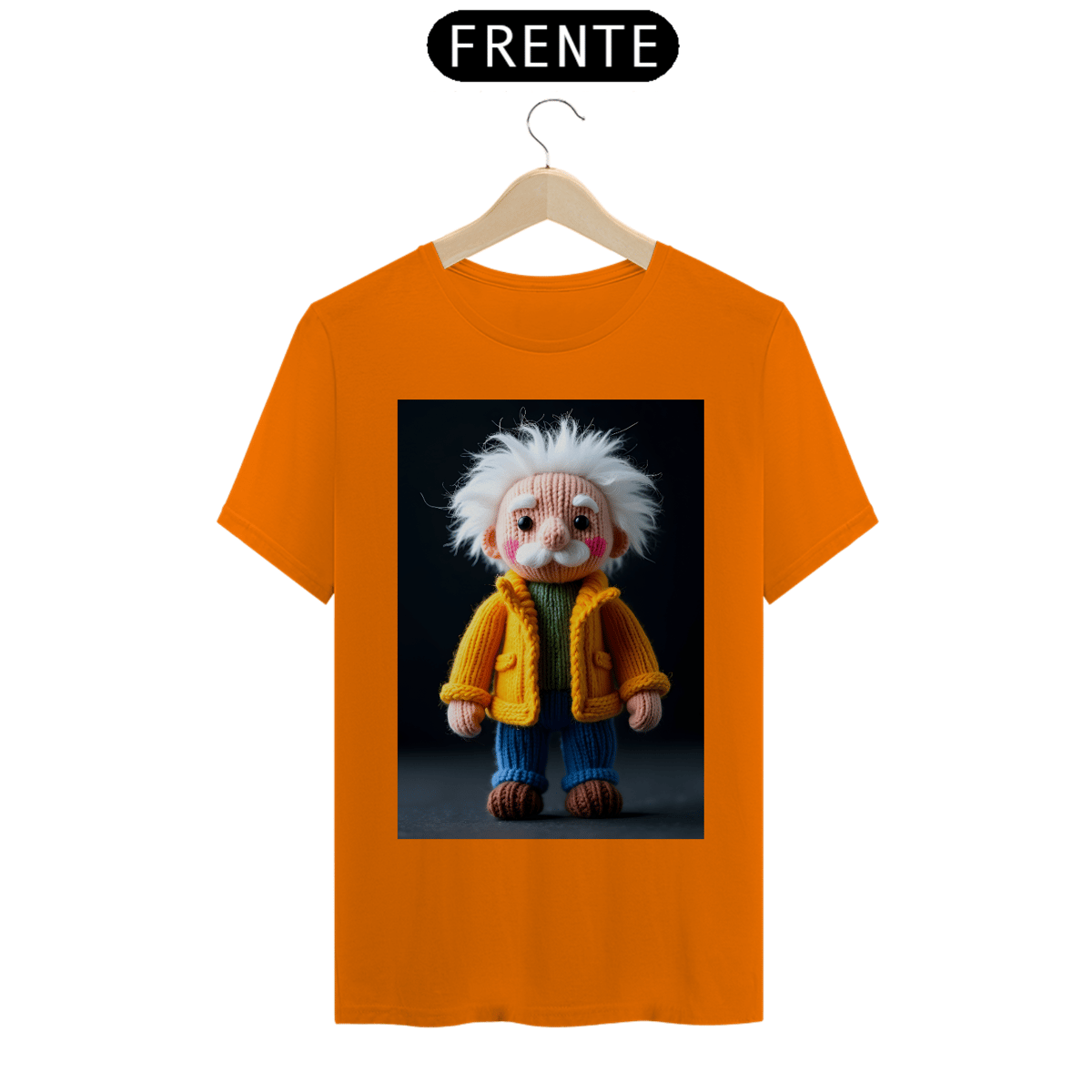 A genialidade pode — e deve — ser representada com ternura! A camiseta "Albert" estampa um adorável boneco de crochê inspirado em ninguém menos que Albert Einstein.