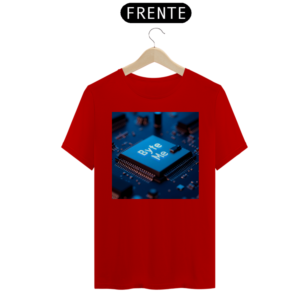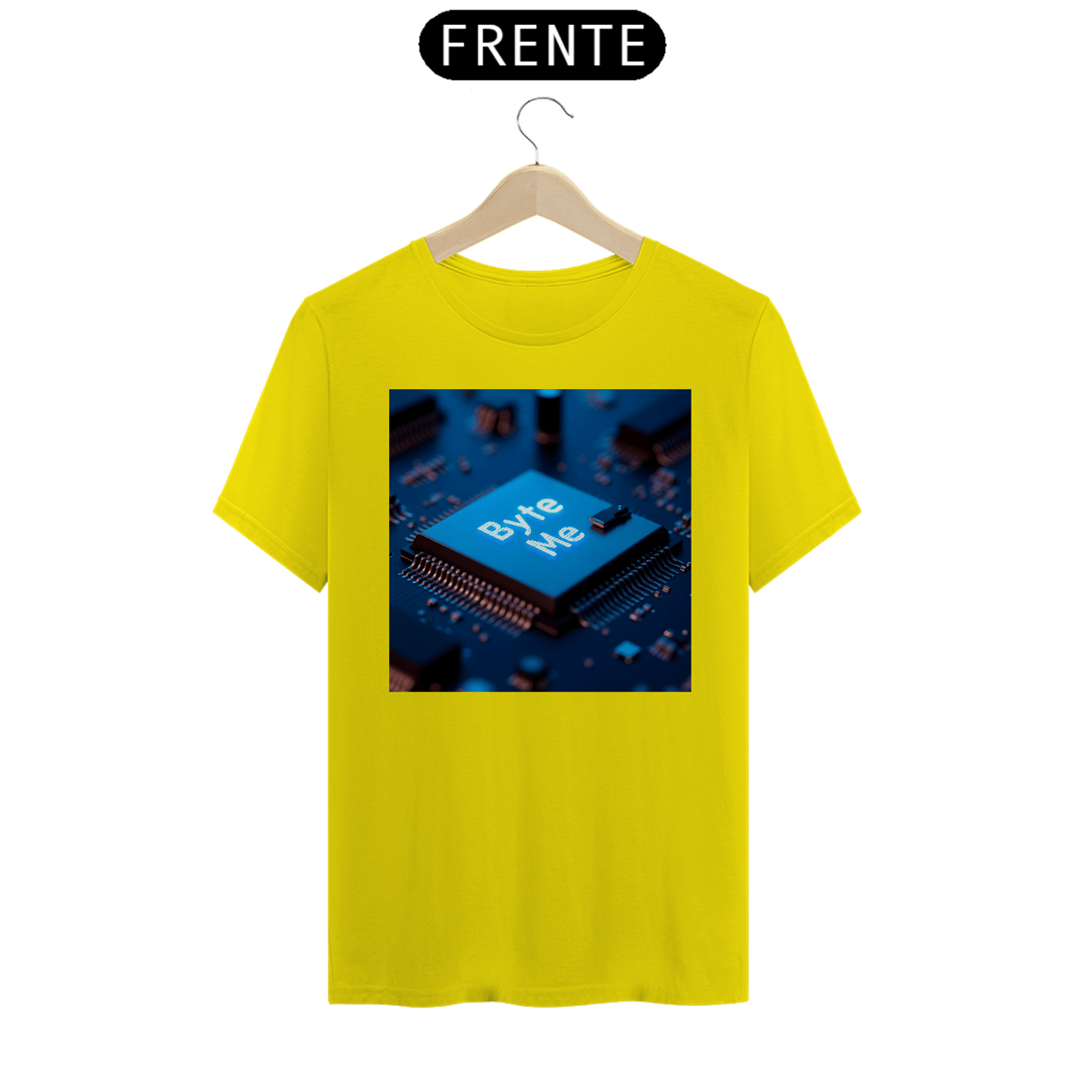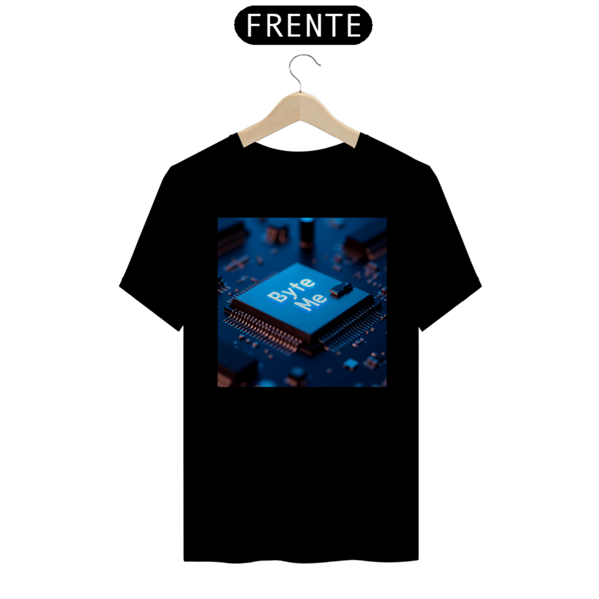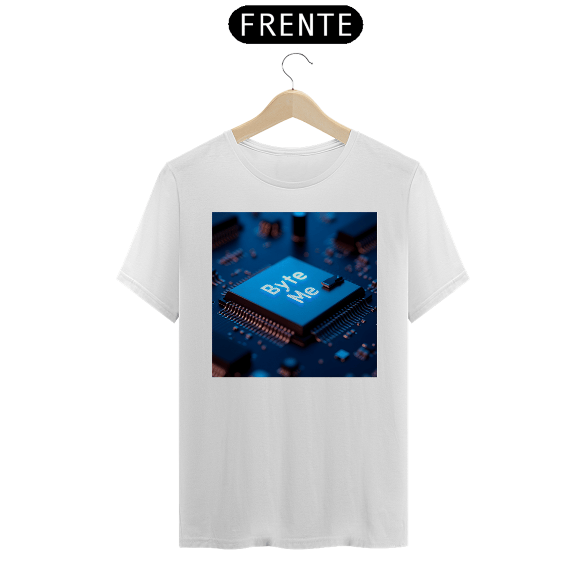 Em fonte pixelada branca, a frase “Byte Me” aparece diretamente sobre o chip, unindo linguagem de programação e um trocadilho afiado, perfeito para quem ama tecnologia, inovação e uma pitada de sarcasmo digital.