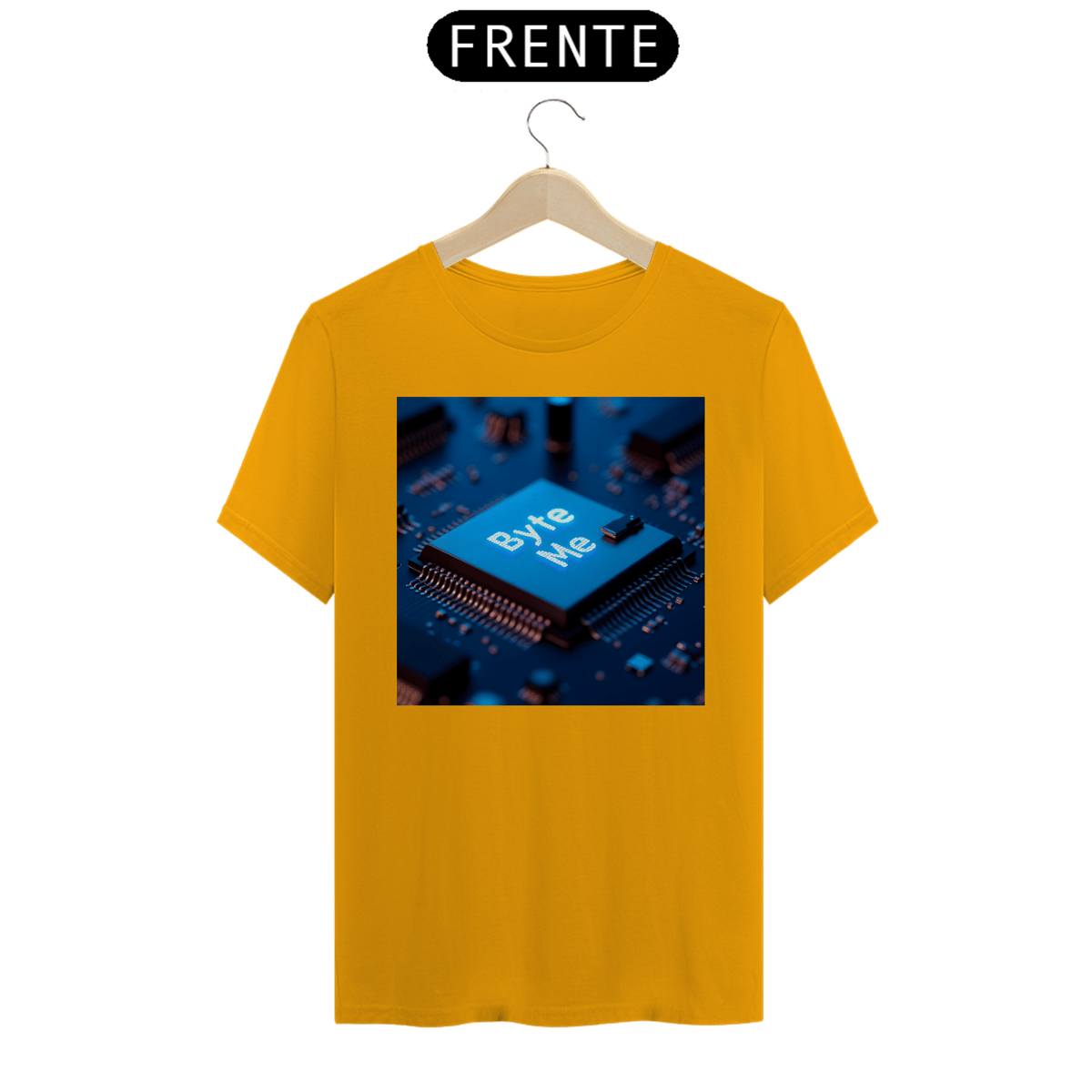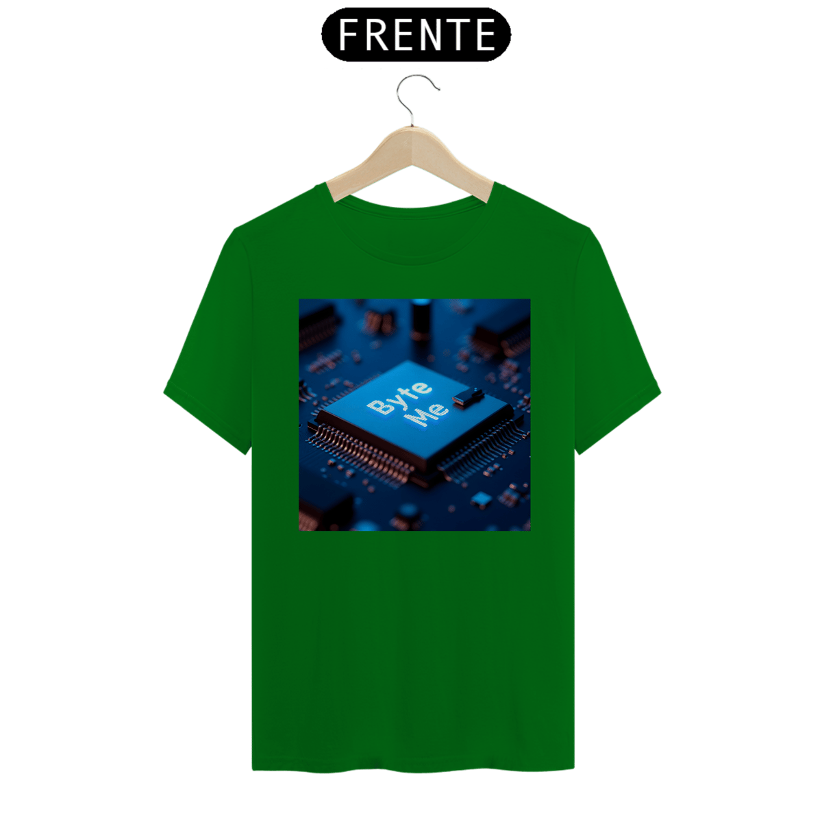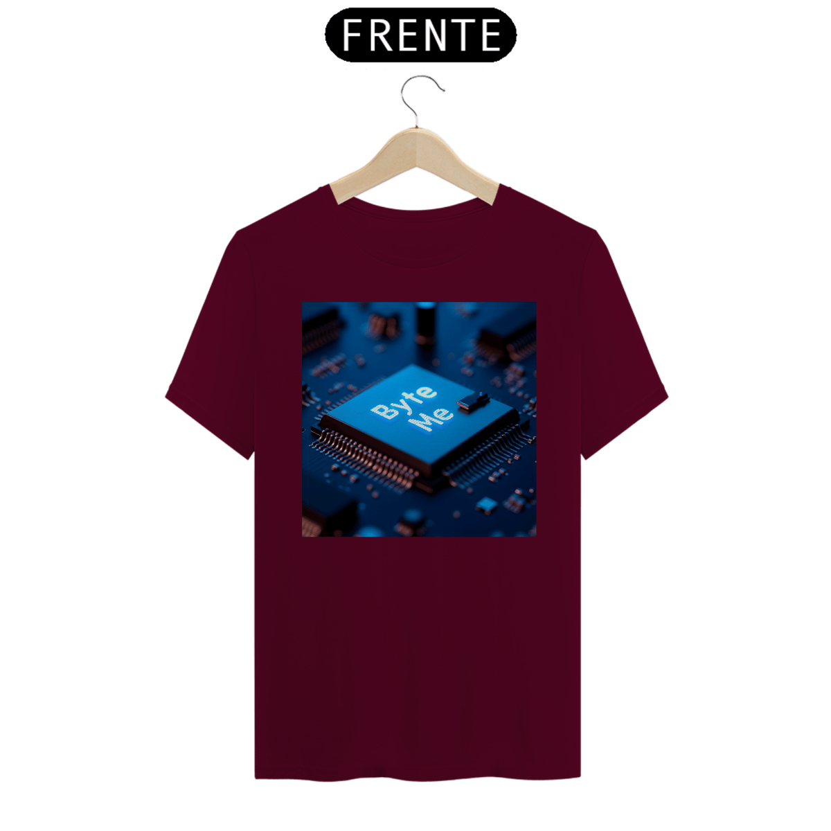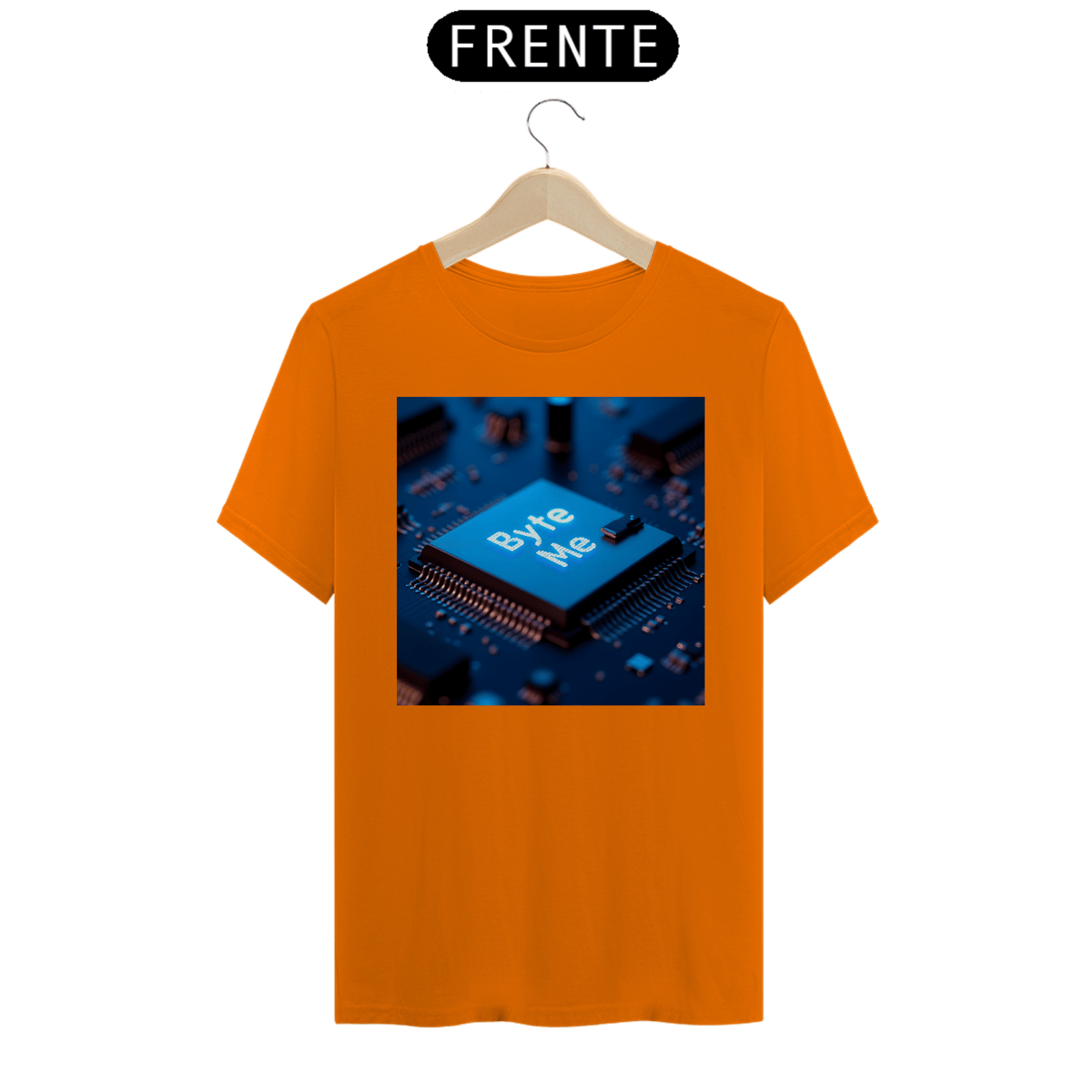 Em fonte pixelada branca, a frase “Byte Me” aparece diretamente sobre o chip, unindo linguagem de programação e um trocadilho afiado, perfeito para quem ama tecnologia, inovação e uma pitada de sarcasmo digital.