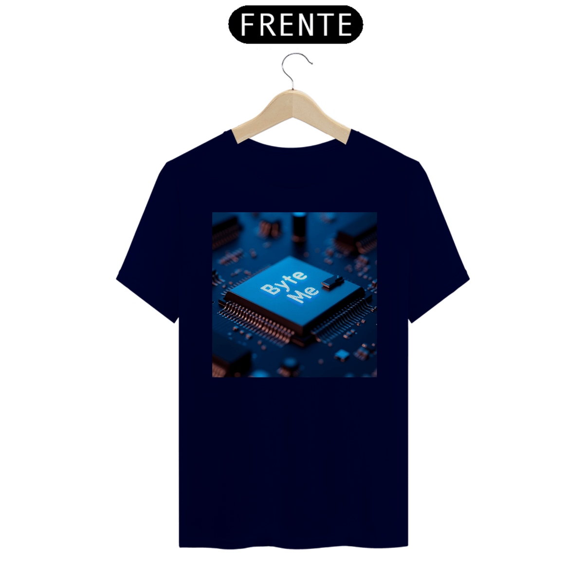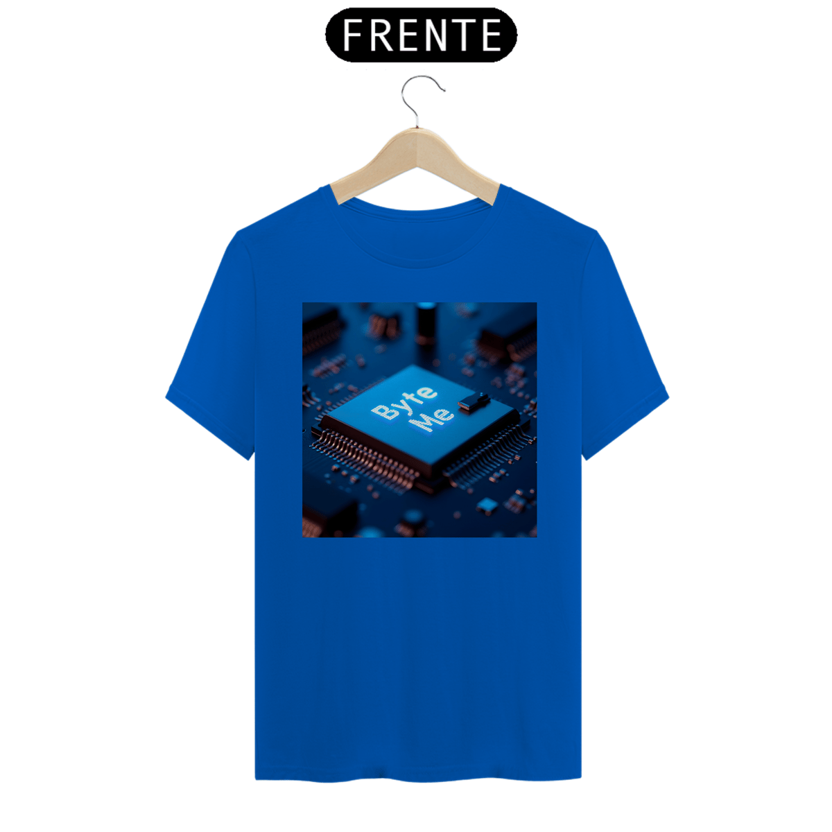 Dê um toque de humor e atitude geek ao seu visual com a camiseta "Byte Me". A estampa traz um close-up impressionante de um microchip brilhando em um azul elétrico, posicionado no centro de uma placa de circuito sofisticada.
