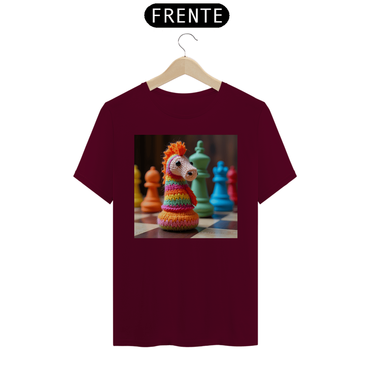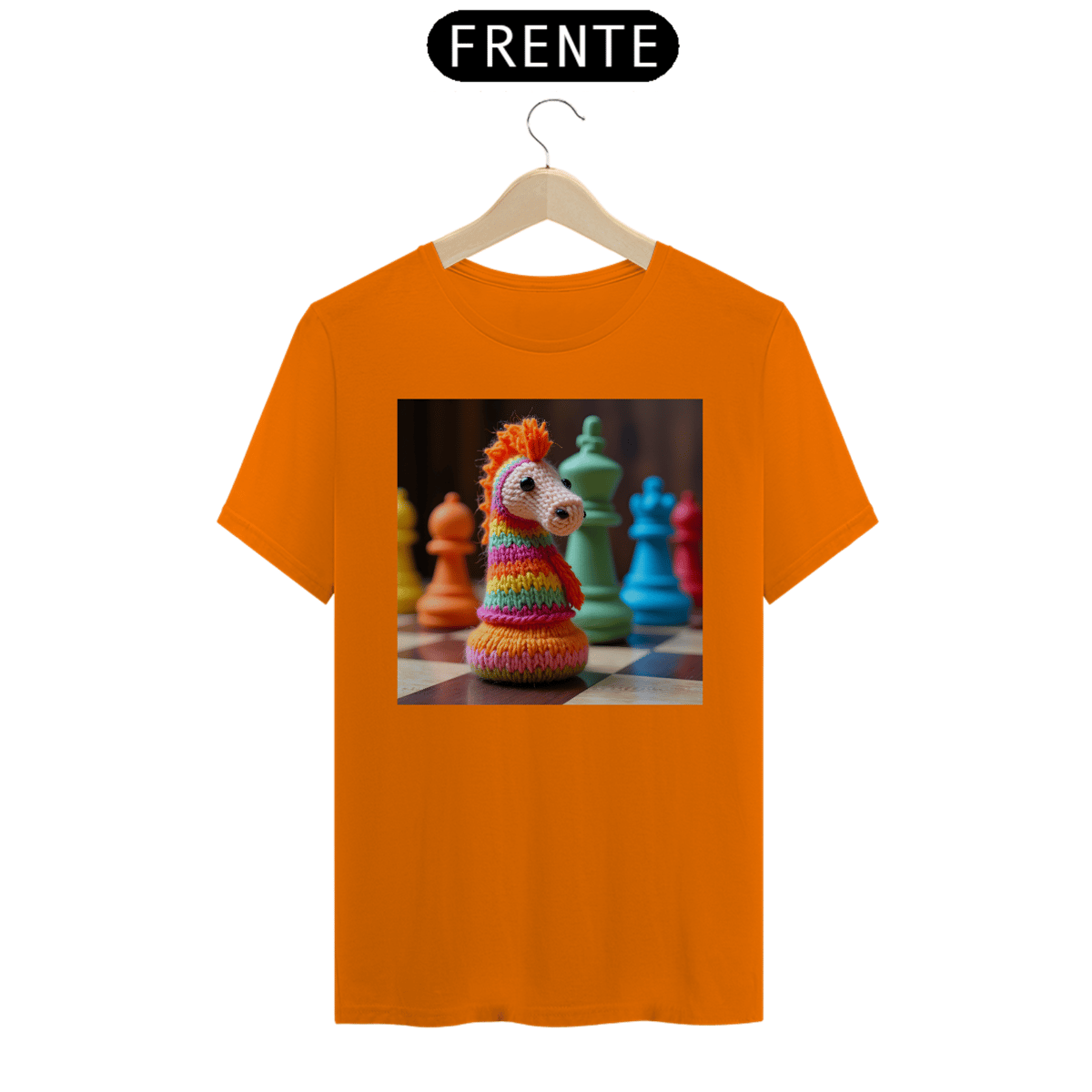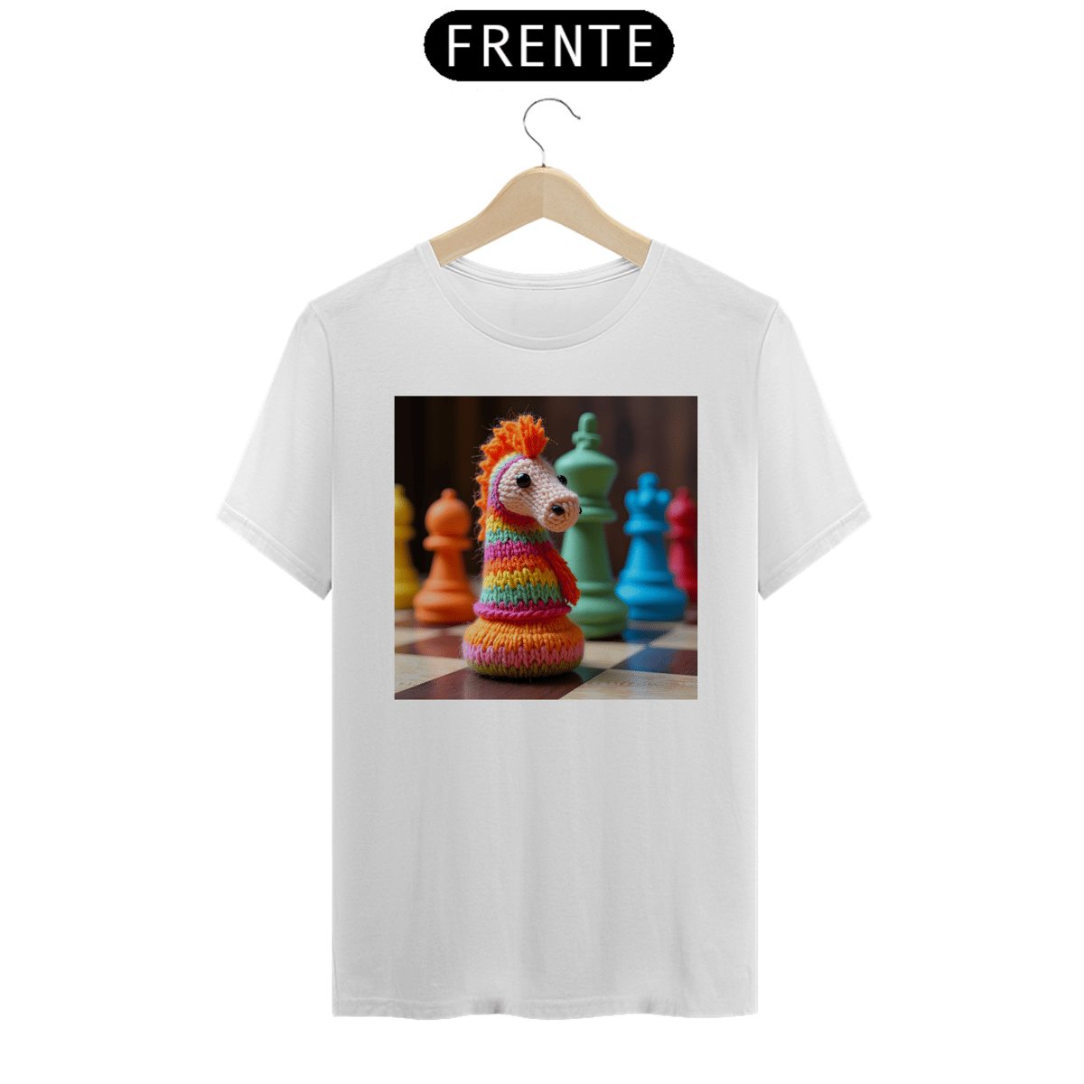 Delicadeza, cor e estratégia reunidas em uma estampa única! A camiseta "Knitted Knight" apresenta um cavalo de crochê super colorido, com corpo em arco-íris e crina laranja vibrante, posicionado sobre um tabuleiro de xadrez clássico, em tons terrosos.