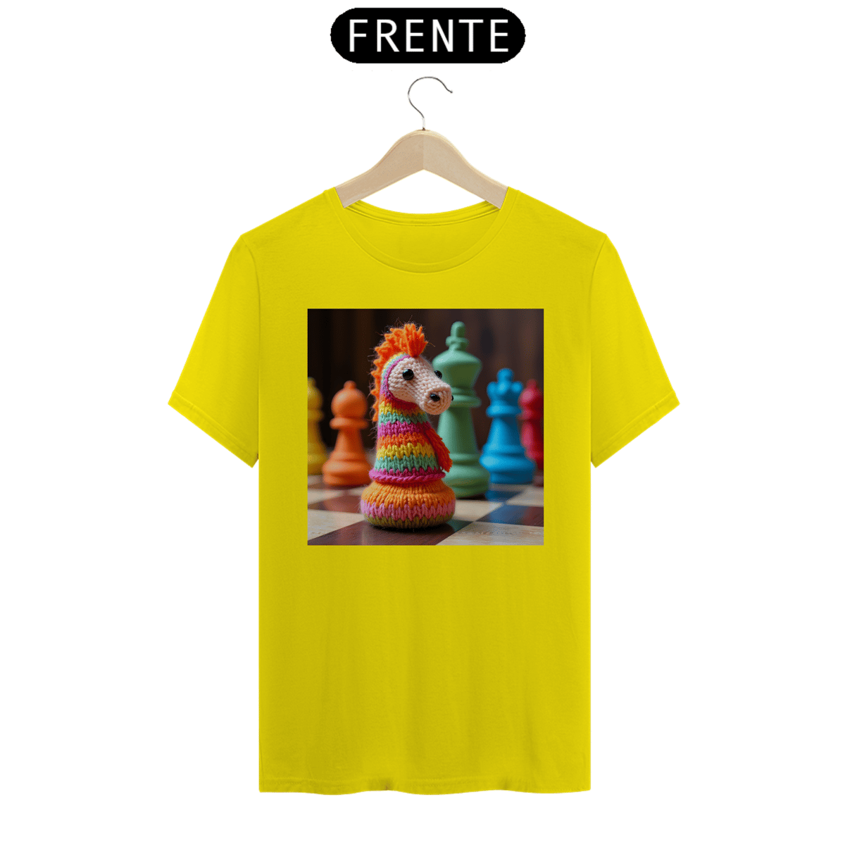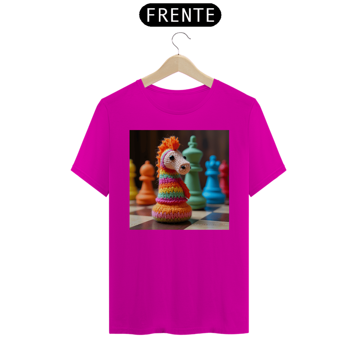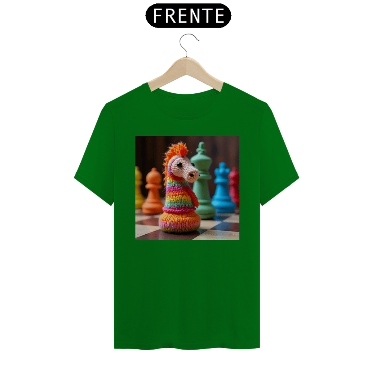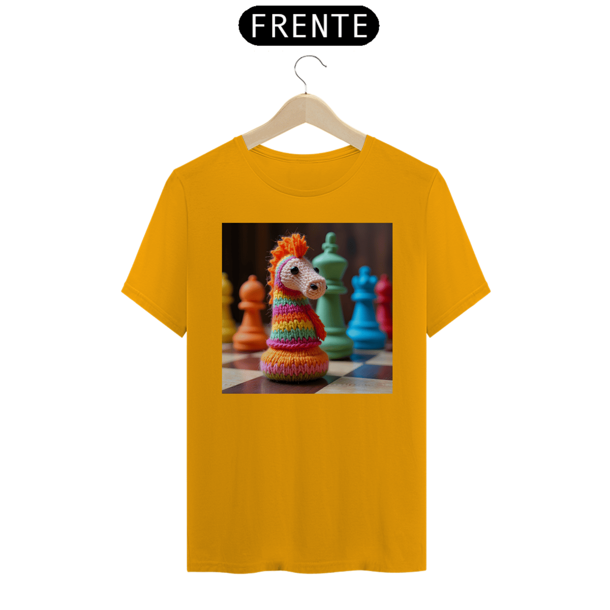 Delicadeza, cor e estratégia reunidas em uma estampa única! A camiseta "Knitted Knight" apresenta um cavalo de crochê super colorido, com corpo em arco-íris e crina laranja vibrante, posicionado sobre um tabuleiro de xadrez clássico, em tons terrosos.
