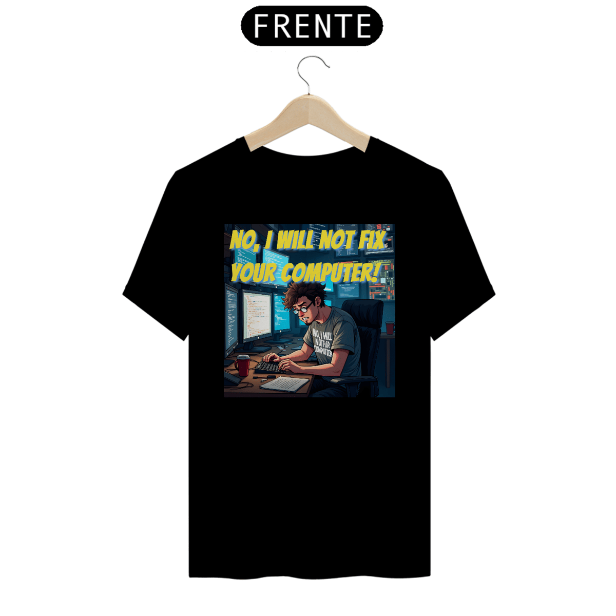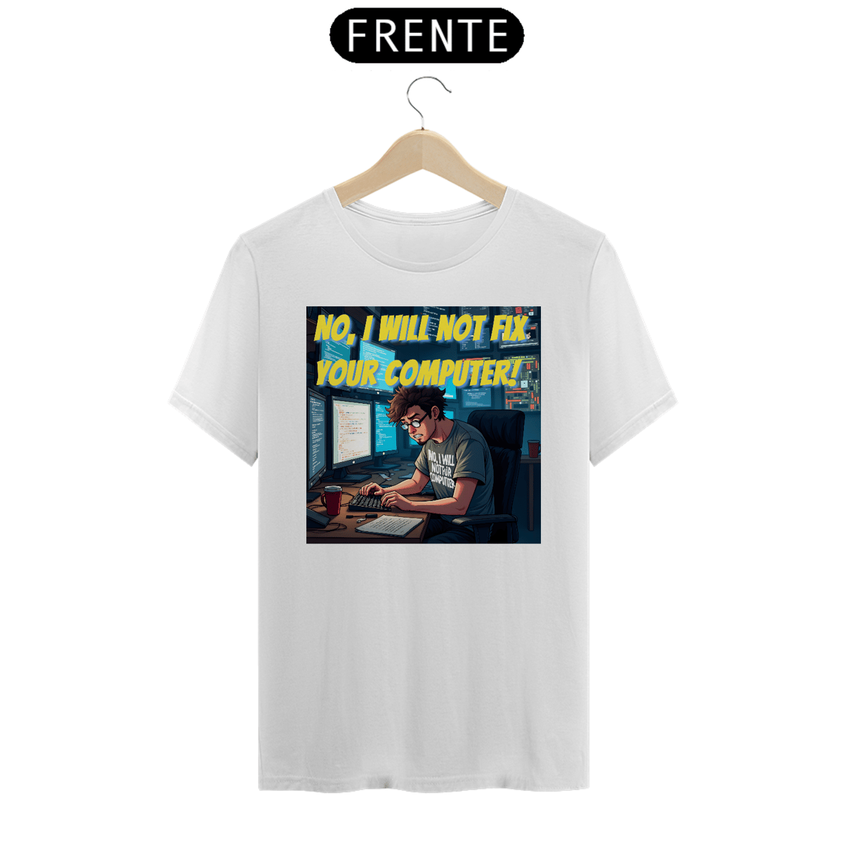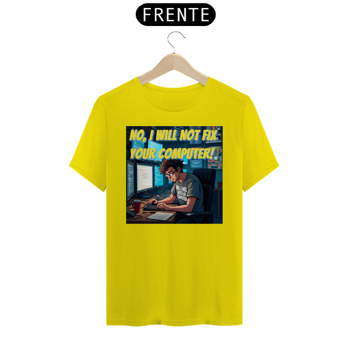Na estampa, a icônica frase aparece logo no topo, em amarelo vibrante, para não deixar dúvidas. A cena retrata um programador de visual marcante: cabelo castanho bagunçado, barba por fazer, óculos de armação preta e, claro, uma camiseta cinza que reforça o mesmo aviso: “NO, I WILL NOT FIX YOUR COMPUTER”, agora em branco.