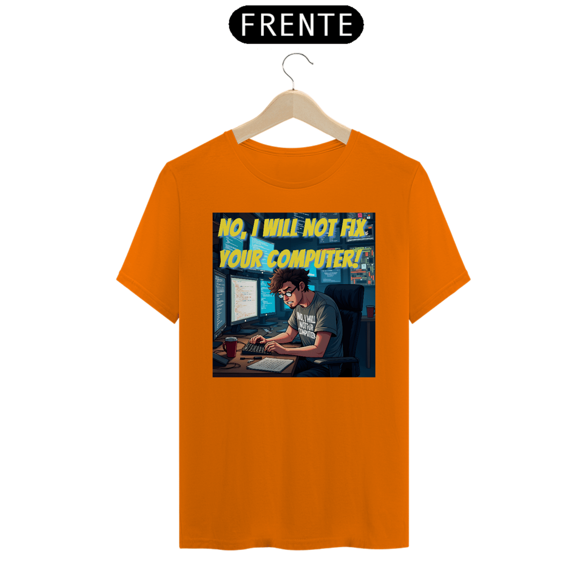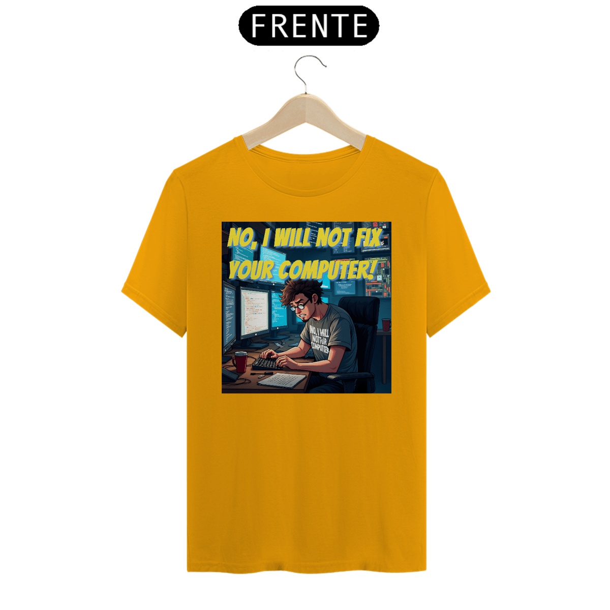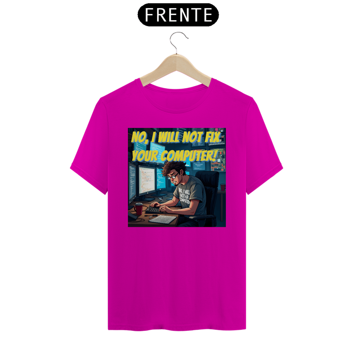 Na estampa, a icônica frase aparece logo no topo, em amarelo vibrante, para não deixar dúvidas. A cena retrata um programador de visual marcante: cabelo castanho bagunçado, barba por fazer, óculos de armação preta e, claro, uma camiseta cinza que reforça o mesmo aviso: “NO, I WILL NOT FIX YOUR COMPUTER”, agora em branco.