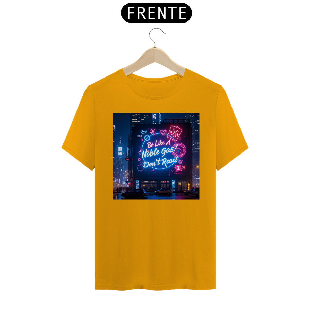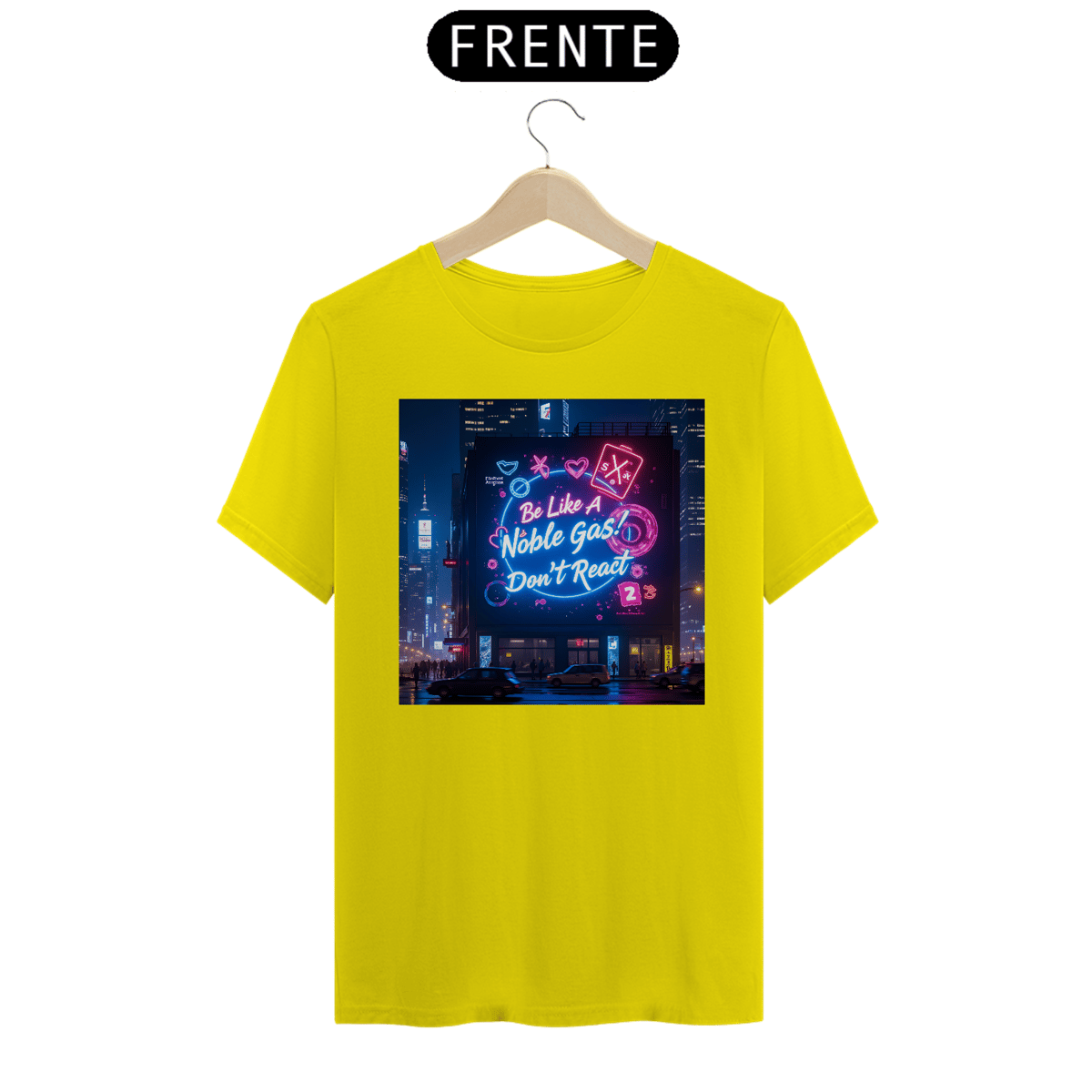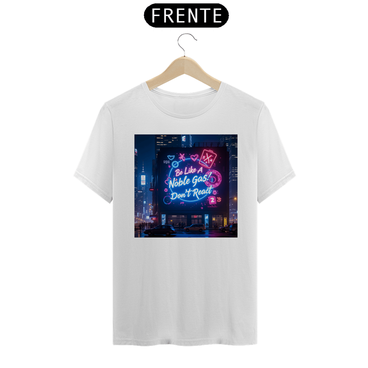 Leve o humor químico para as ruas com a camiseta "Noble Gas"! A estampa traz uma cena vibrante de cidade à noite, com um grande painel digital iluminado que transmite a mensagem perfeita para os fãs de química e estilo de vida zen: