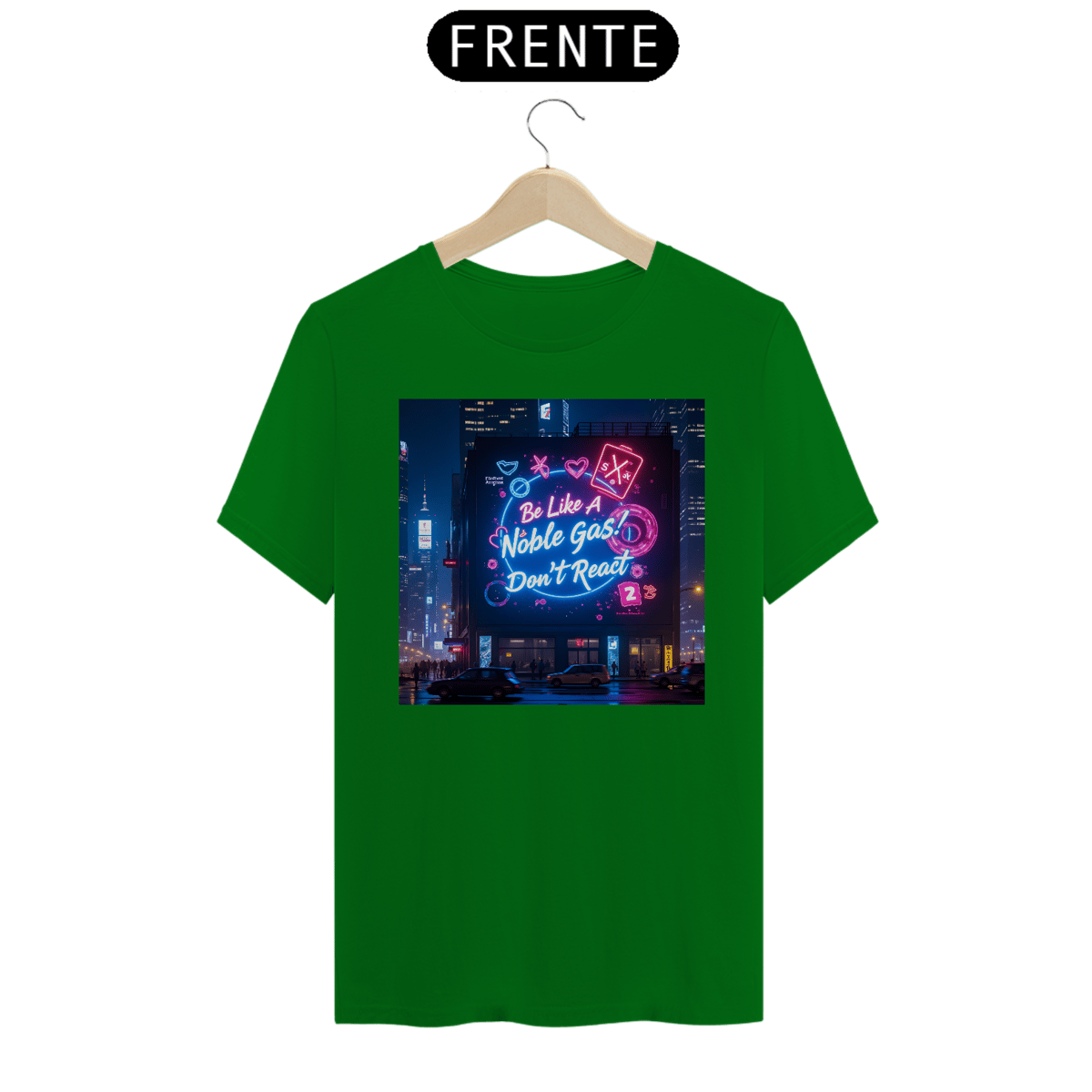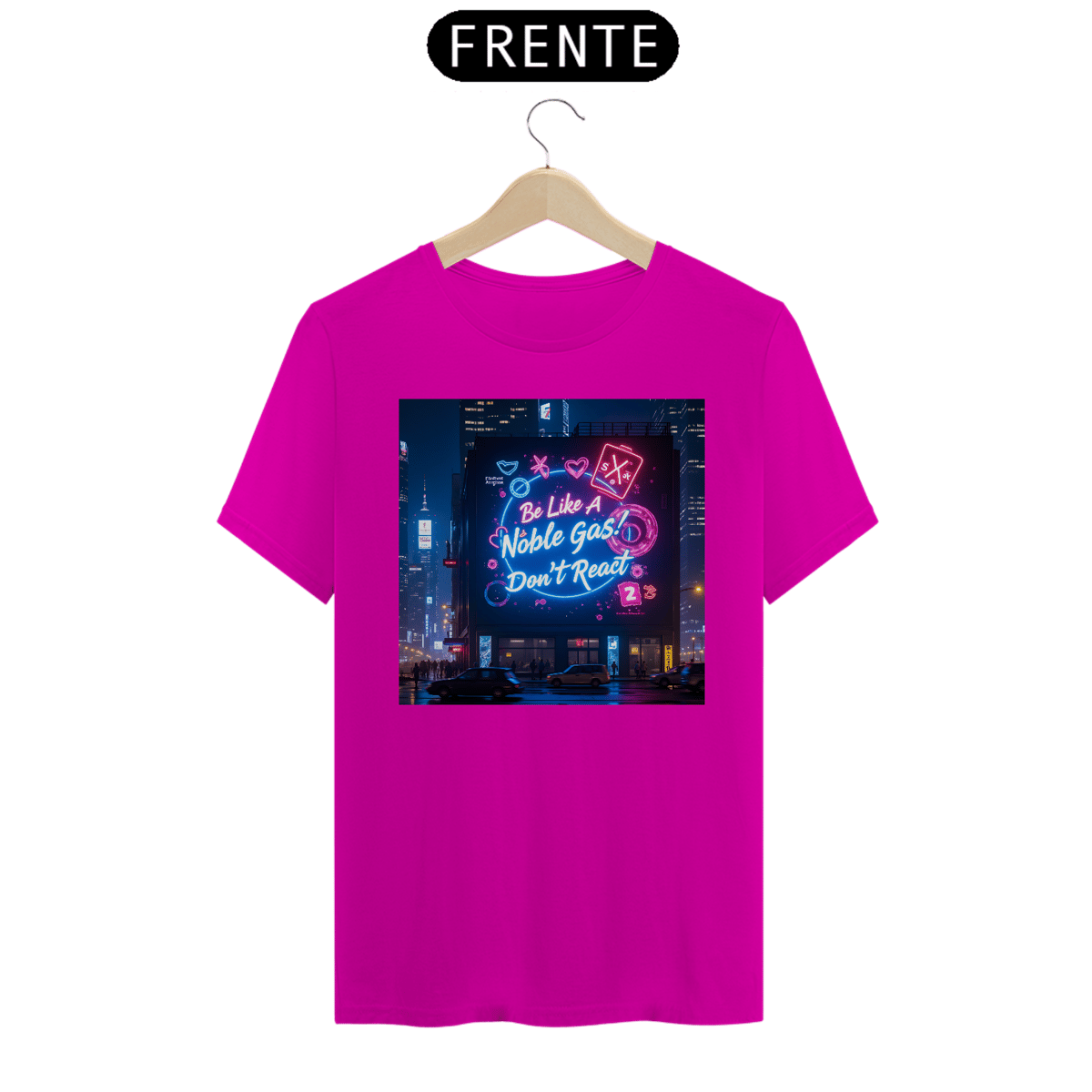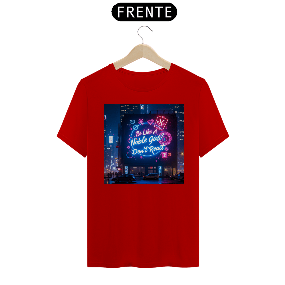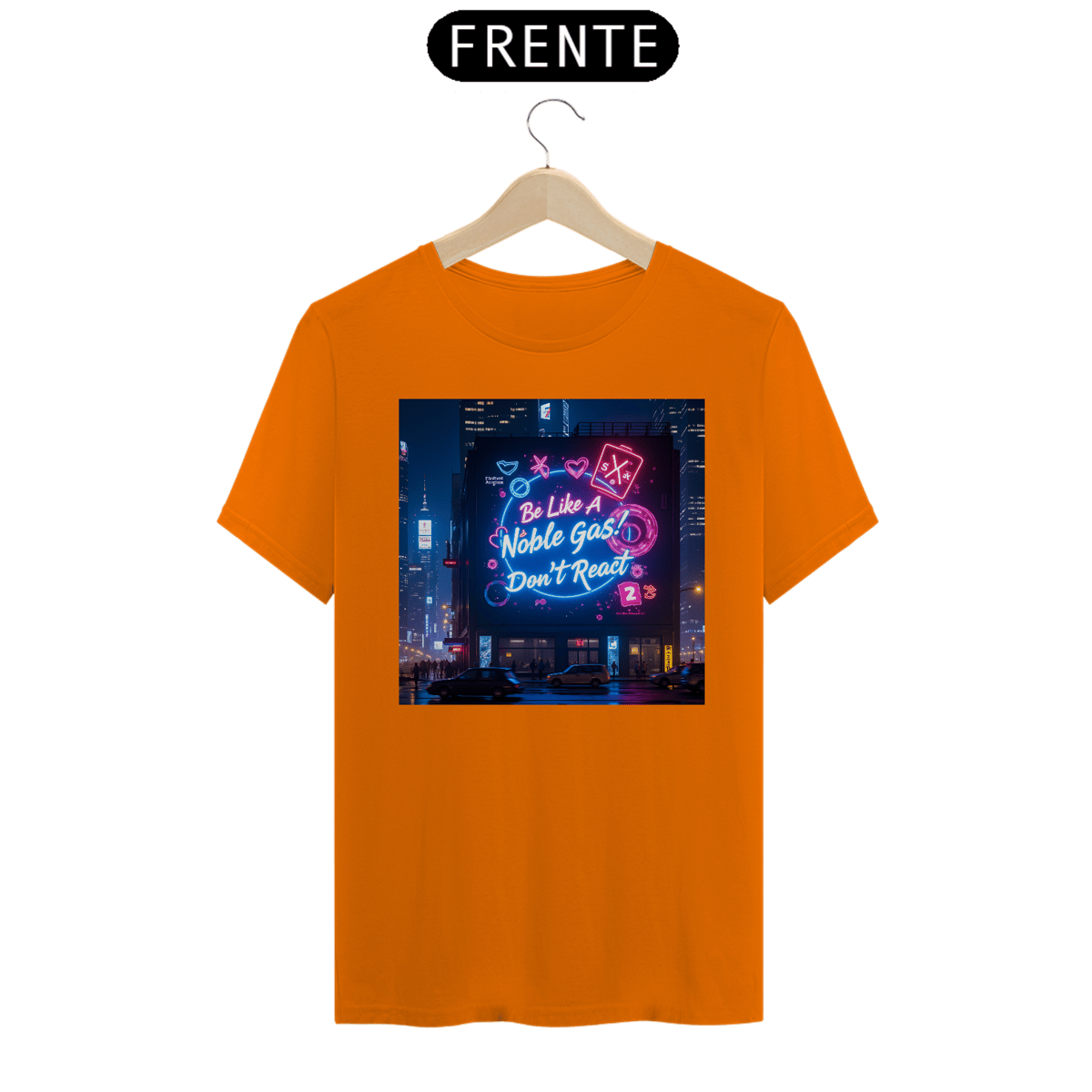 Leve o humor químico para as ruas com a camiseta "Noble Gas"! A estampa traz uma cena vibrante de cidade à noite, com um grande painel digital iluminado que transmite a mensagem perfeita para os fãs de química e estilo de vida zen: