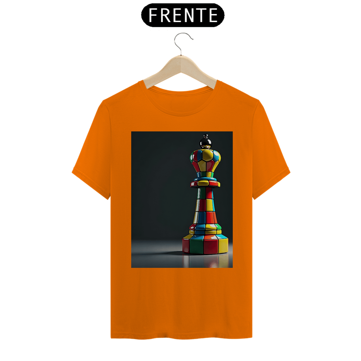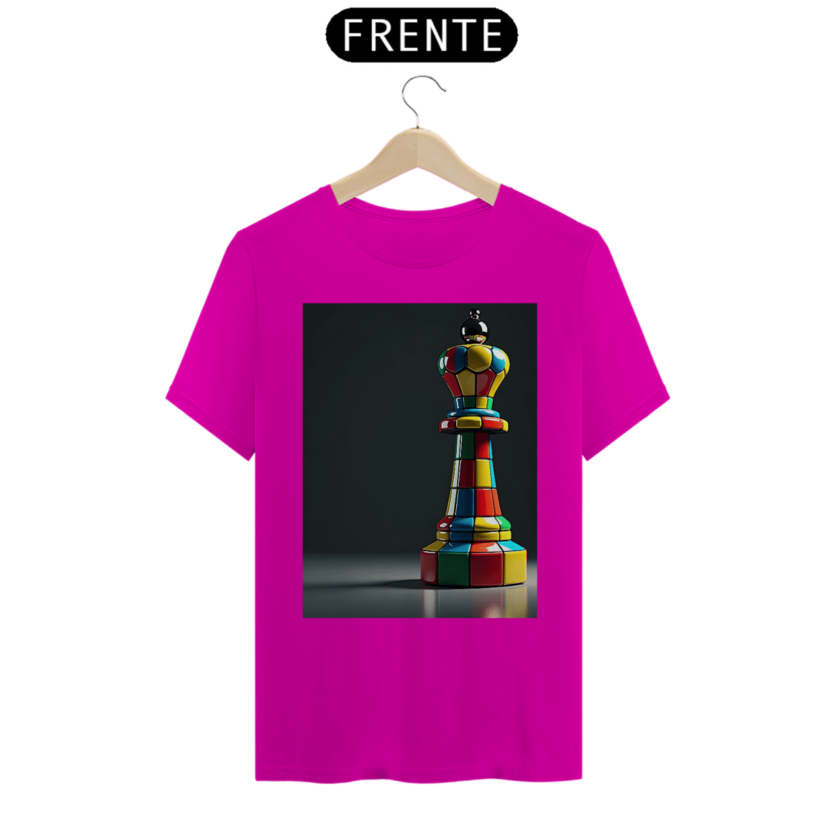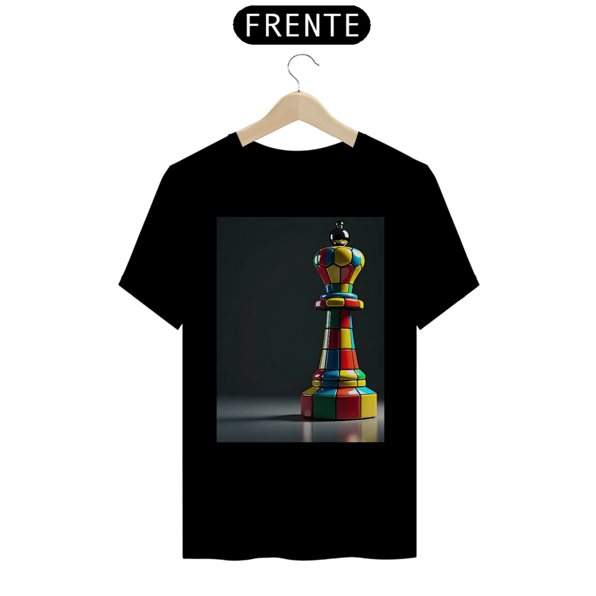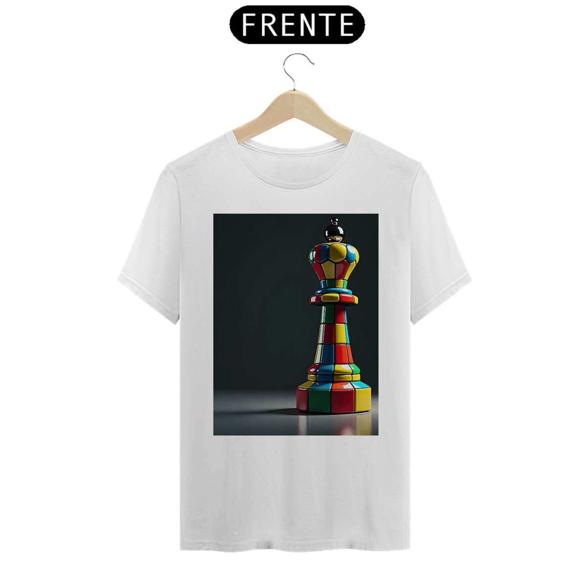 Uma peça icônica, reinventada com cores e lógica! A camiseta "Rubik Queen" apresenta uma estampa exclusiva de uma peça de xadrez que é muito mais do que parece: uma dama construída por blocos brilhantes e multicoloridos, claramente inspirado no lendário Cubo Mágico (Rubik’s Cube).