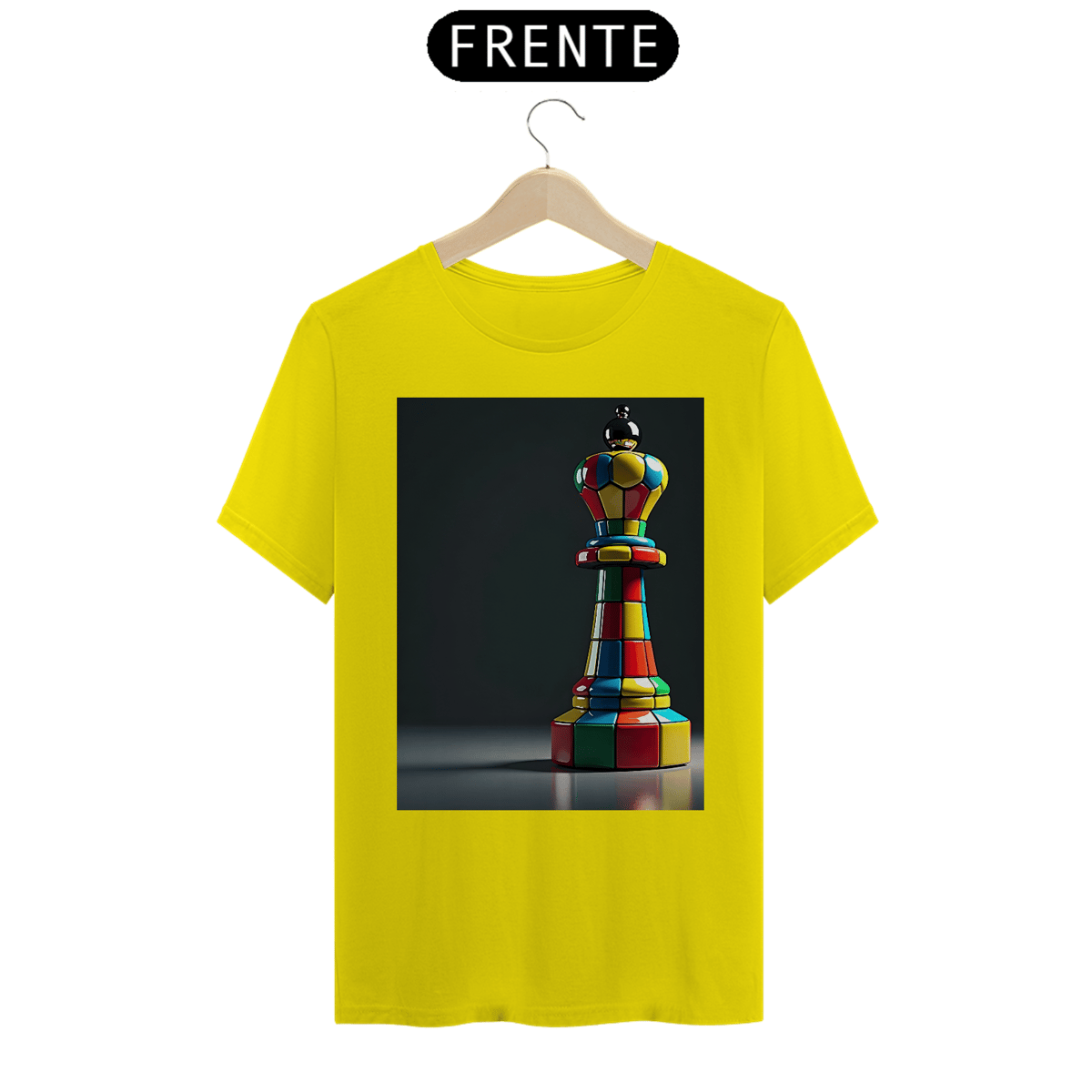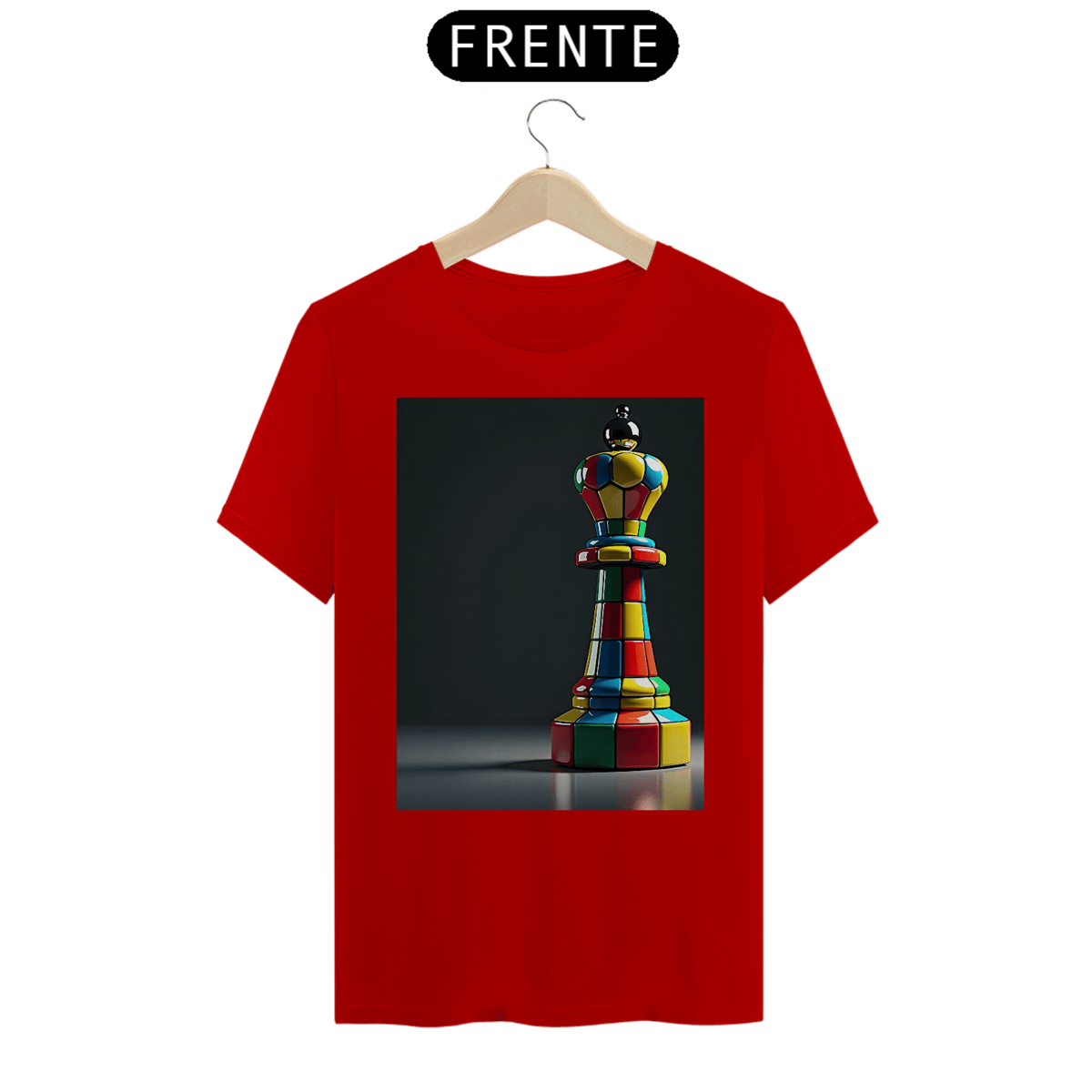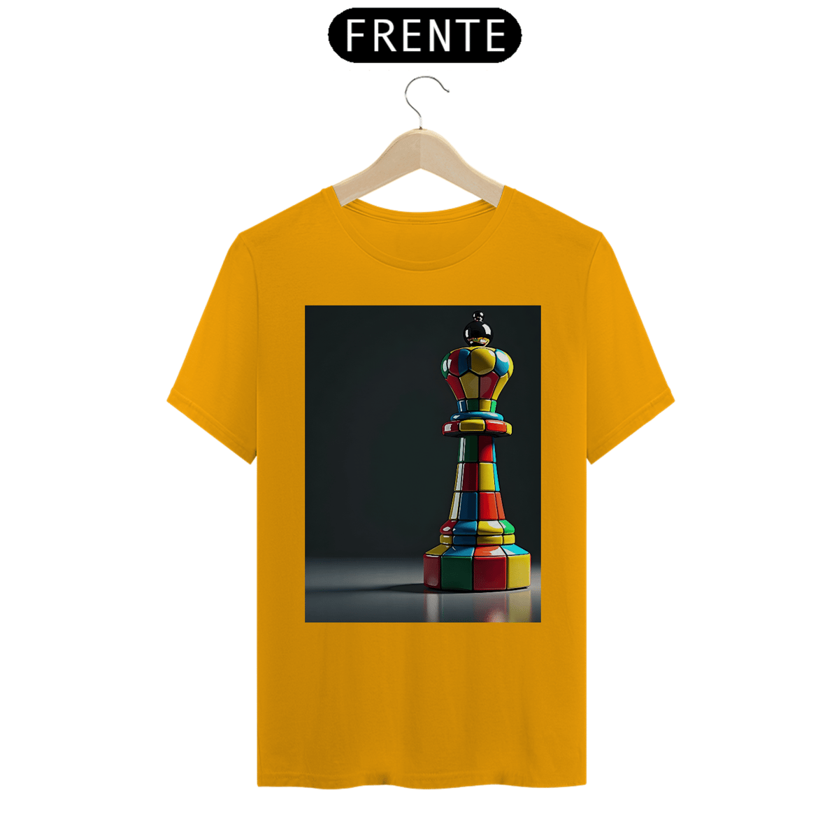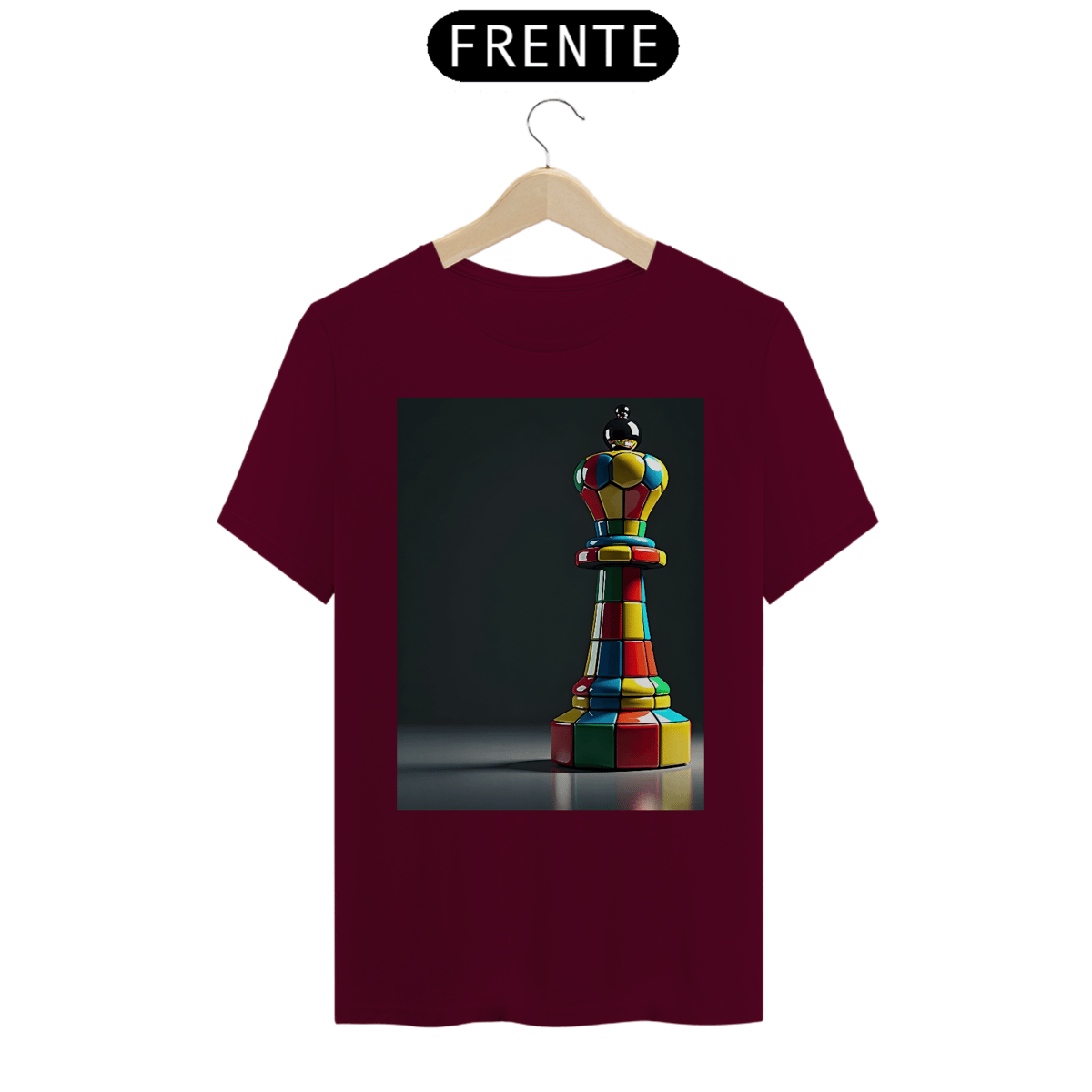Uma peça icônica, reinventada com cores e lógica! A camiseta "Rubik Queen" apresenta uma estampa exclusiva de uma peça de xadrez que é muito mais do que parece: uma dama construída por blocos brilhantes e multicoloridos, claramente inspirado no lendário Cubo Mágico (Rubik’s Cube).