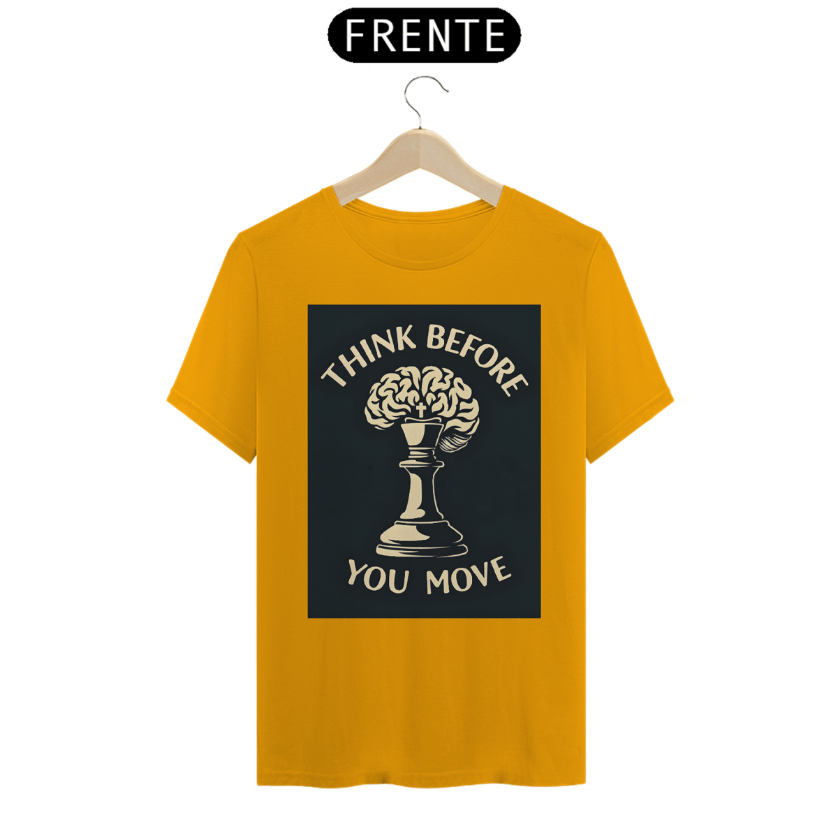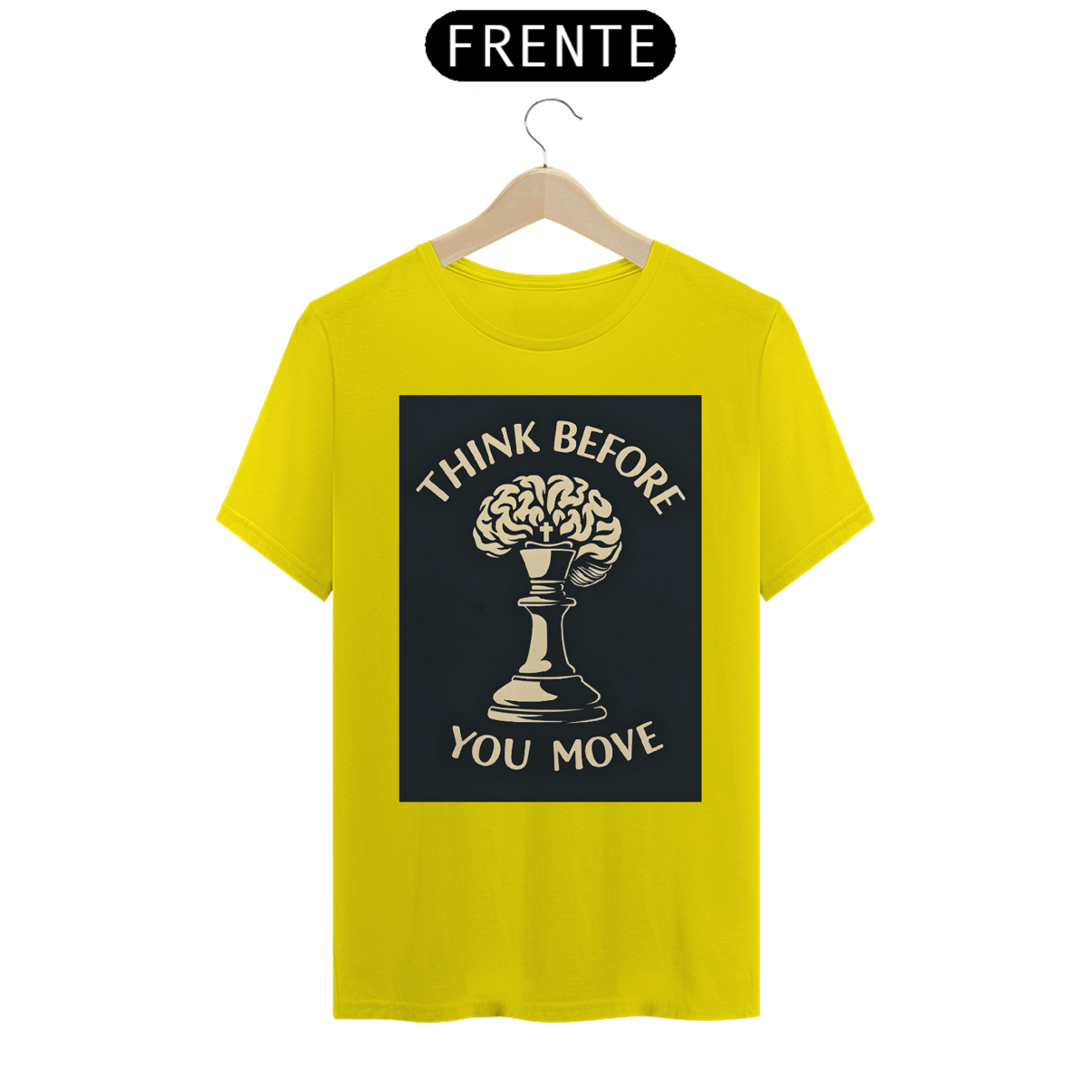 Para quem sabe que cada movimento conta, dentro e fora do tabuleiro. A camiseta "Think Before" apresenta um design minimalista e impactante: sobre um fundo cinza-escuro, um gráfico em amarelo-claro exibe um rei de xadrez com um cérebro emergindo do topo — coroado por uma cruz.