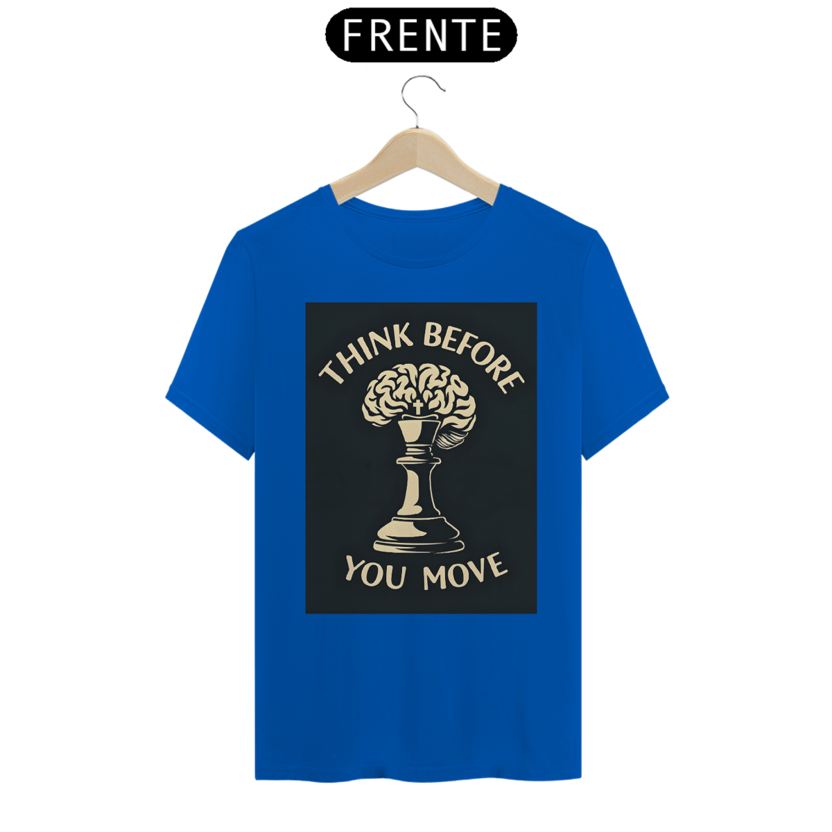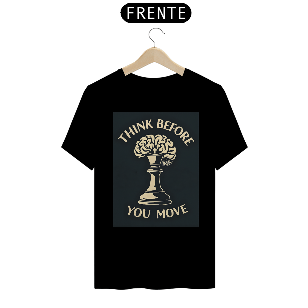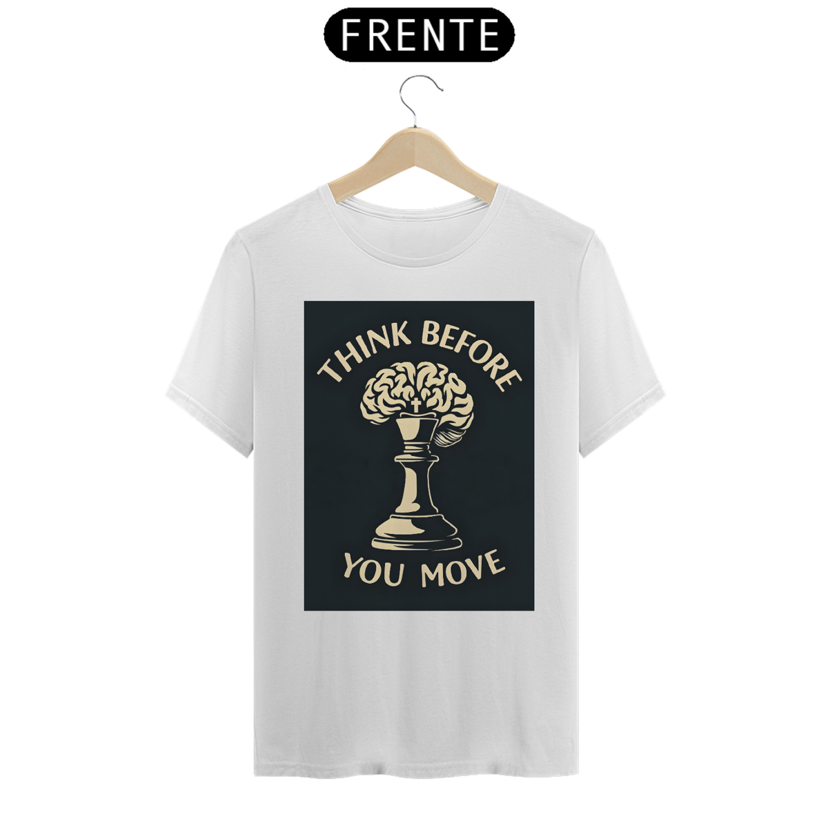 Acima e abaixo da figura, a frase “THINK BEFORE YOU MOVE” é escrita em uma fonte manuscrita, reforçando a mensagem de reflexão, estratégia e autocontrole.