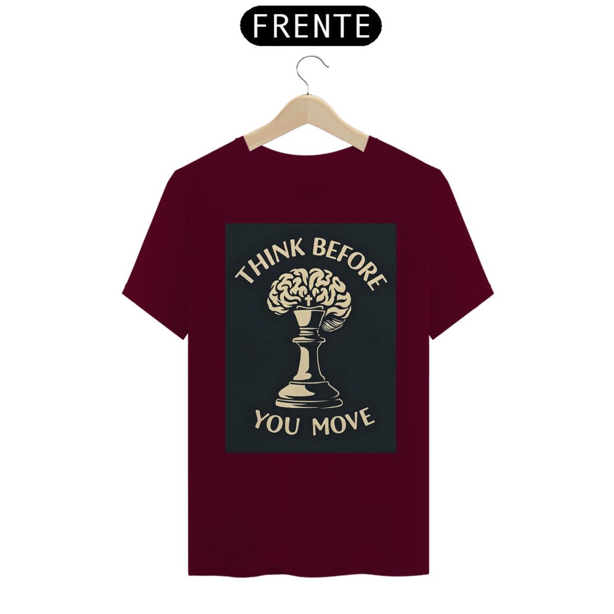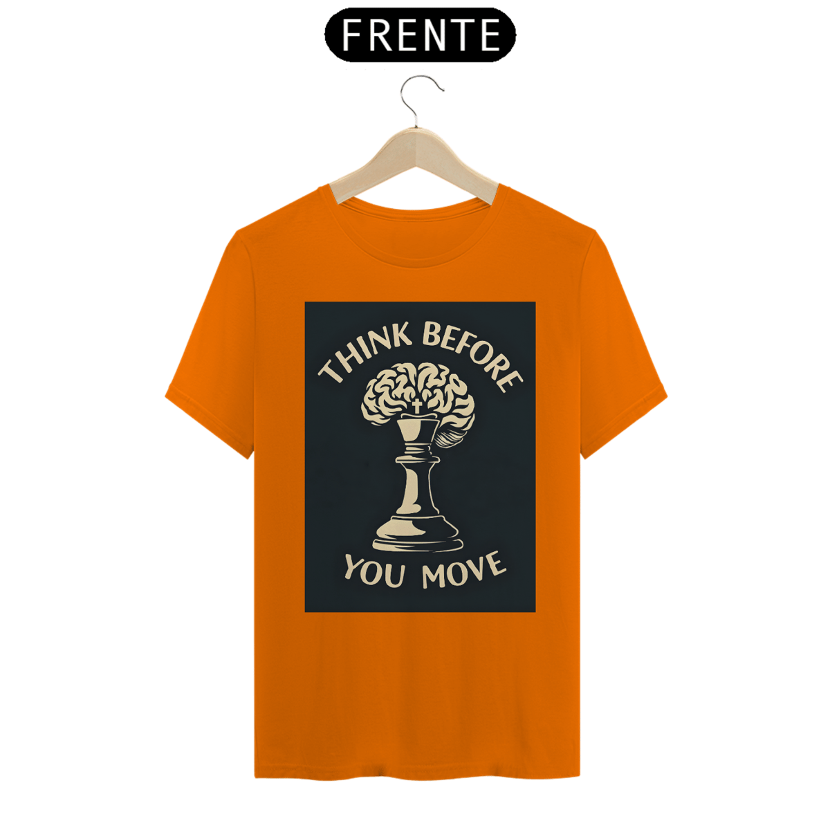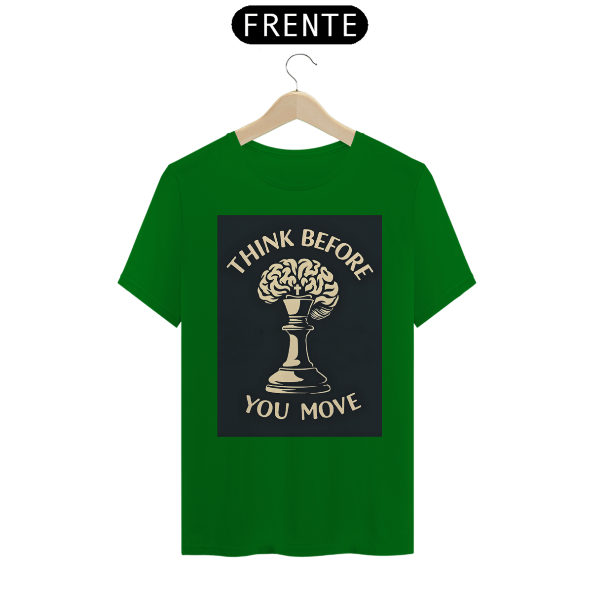 Acima e abaixo da figura, a frase “THINK BEFORE YOU MOVE” é escrita em uma fonte manuscrita, reforçando a mensagem de reflexão, estratégia e autocontrole.